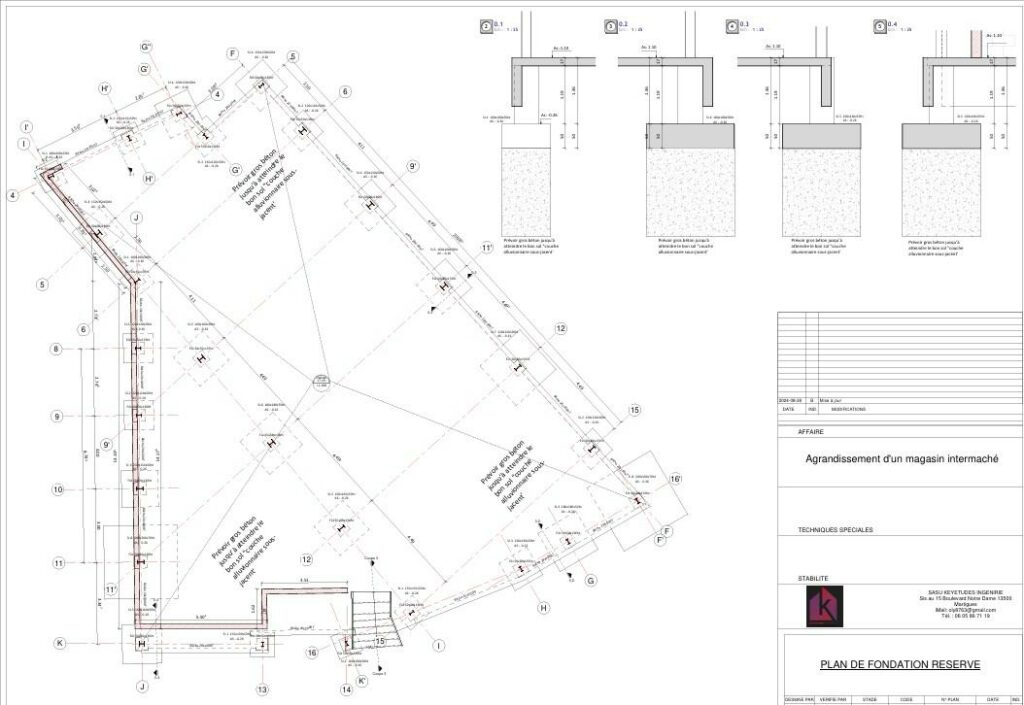 Nous avons établis les plans de coffrage et ferraillage de toutes les fondations.